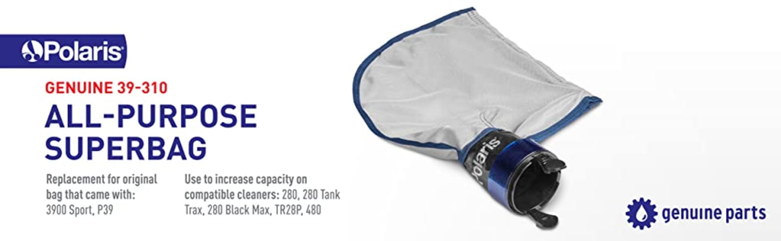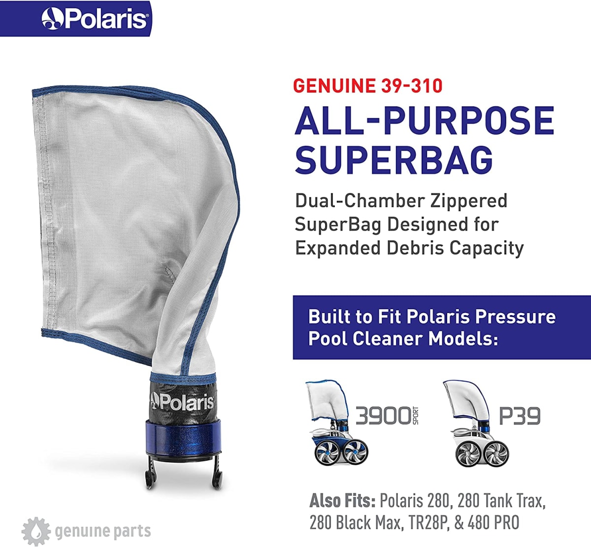 The Polaris 39-310 Superbag is a large, double-chambered replacement filtration bag designed for the Polaris 3900 Sport or P39 pressure side vac-sweep pool cleaners. The 39-310 Superbag is gray in color and expands to hold up to 5 liters of large and small debris within the dual-zippered chambers, giving almost twice as much debris capacity as a single chamber Polaris pool cleaner bag.