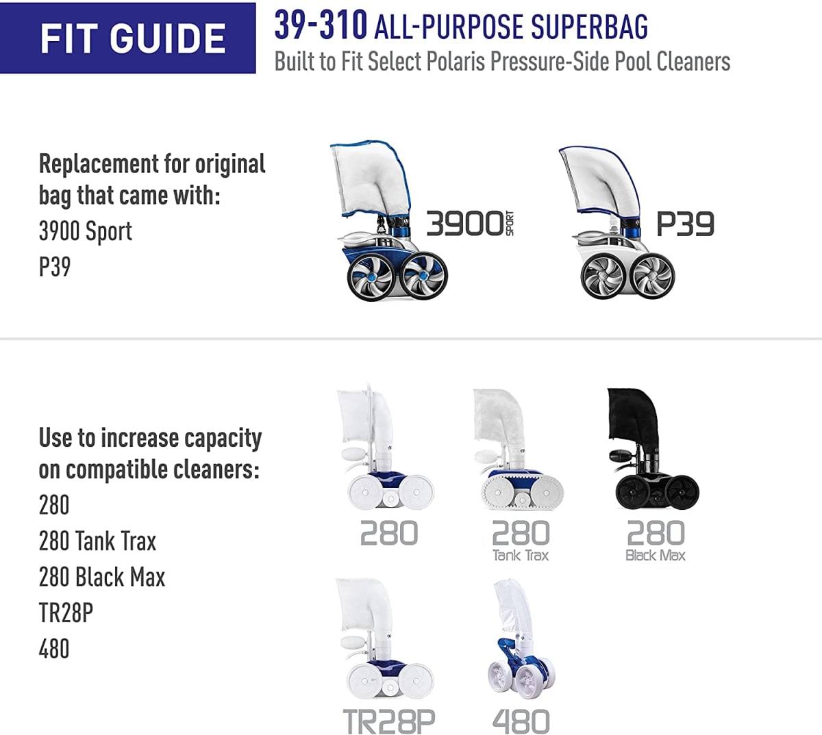 This bag is also compatible with: Polaris 280, 280 Tank Trax, 280 Black Max, TR28P, 480
