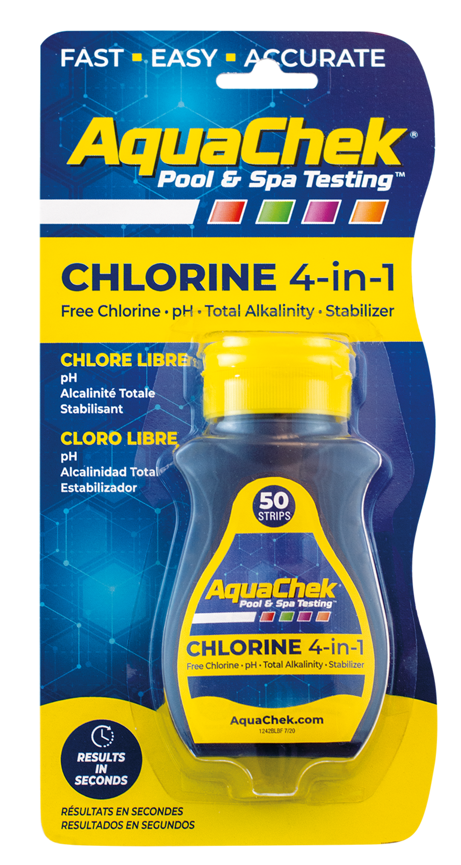 Swimming Pool Chlorine Test Strips by AquaChek. These test strips test for four key values Free Chlorine, Cyanuric Acid, pH and Total Alkalinity. A quantity of 50 strips per bottle. To test the water, just dip an AquaChek strip in the pool water for one second, and remove immediately. Compare the colors on the stip to the bottle, thats it! You get test results in seconds! To keep your pool at its best, test each week. It's also a good idea to write down your results each time you test, so you can track changes.
