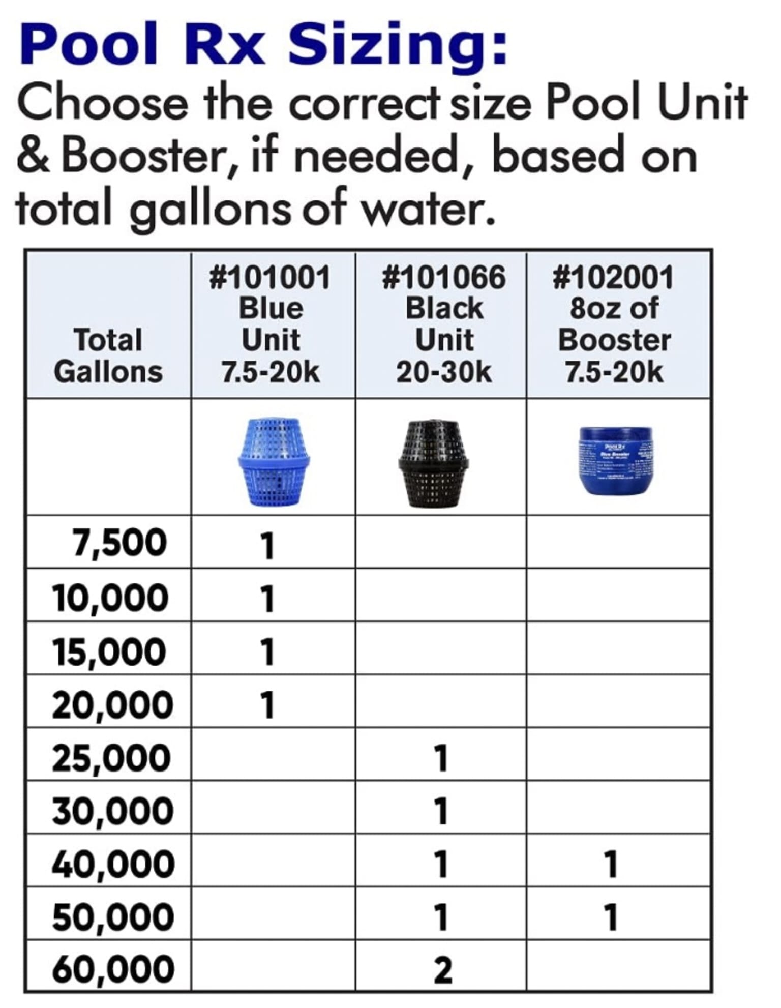 The PoolRx Booster is the same EPA Registered, all natural mineral formulation that is packed inside the PoolRx and PoolRx Extreme units. The Booster is used in conjunction with these units and adds a low residual of chlorine (0.5ppm residential) (1.5-2.0ppm commercial) to effective eliminate all types of algae and bacteria the natural way. Blue Booster minerals need to be added every 4 to 6 months based on bather load, conditions and algae.