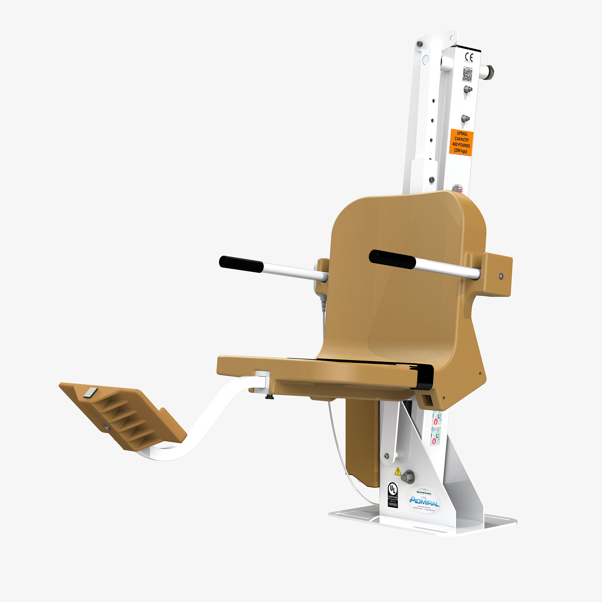 The ADA Compliant, UL Certified, Admiral™ is an incredibly strong and durable lift. The Admiral™ features a unique, non-rotating design that is for use on in-ground pools and spas. It does not stand too tall and has a very small footprint. This makes it an incredibly solid, durable, and reliable product that blends in with almost any décor. The 450-pound (204 kg) weight capacity of this lift provides pool access to an even greater number of swimmers. The adjustable seat height also makes this lift easier to transfer for people in taller wheelchairs.