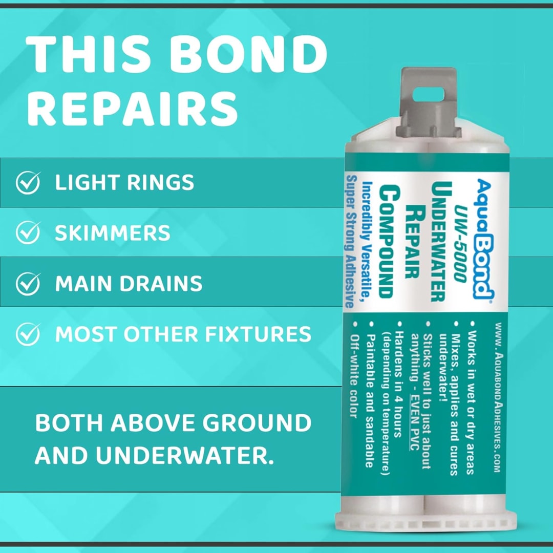 Introducing the AQUABOND Underwater Repair Epoxy Kit, your ultimate solution for hassle-free pool repairs. Dive into worry-free maintenance with this specialized epoxy designed for underwater application, ensuring secure bonding without the need to drain your pool. Versatility is at its core, as this kit tackles a wide array of issues including cracks, leaks, and repairs on fiberglass and PVC materials, making it suitable for both professionals and DIY enthusiasts. With its heavy-duty performance, reinforced by fiberglass and PVC components, expect lasting results that withstand the test of time. The comprehensive package includes essential tools like the DM-50 dispensing gun, 50ml UW-5000 cartridge, mixers, Polyethylene film, and a user-friendly manual, coupled with an innovative patent-pending application process. Crafted to marine-grade quality standards, this kit is trusted by pool owners and professionals for its reliability, ensuring consistent performance even in harsh aquatic environments. Say goodbye to pool repair worries and hello to seamless maintenance with the AQUABOND Underwater Repair Epoxy Kit.