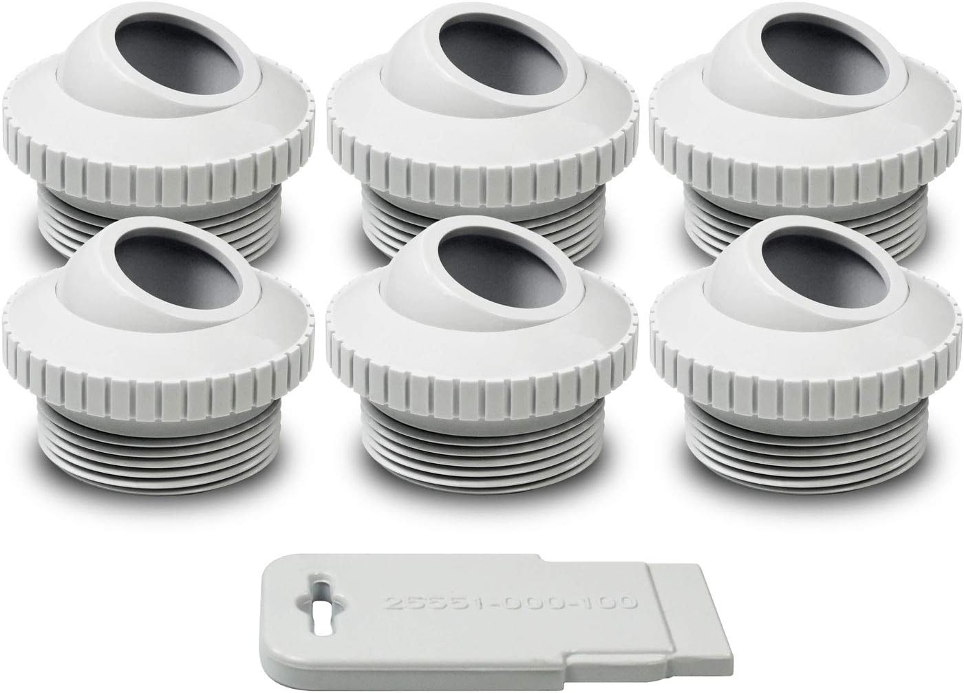 Refresh your plastic jets in your pool. This kit includes 6 return white jet fitting and 1 Installation tool. They fit into a standard 1-1/2" threaded PVC pool wall return fitting. And the eyeball hole is 1/2".