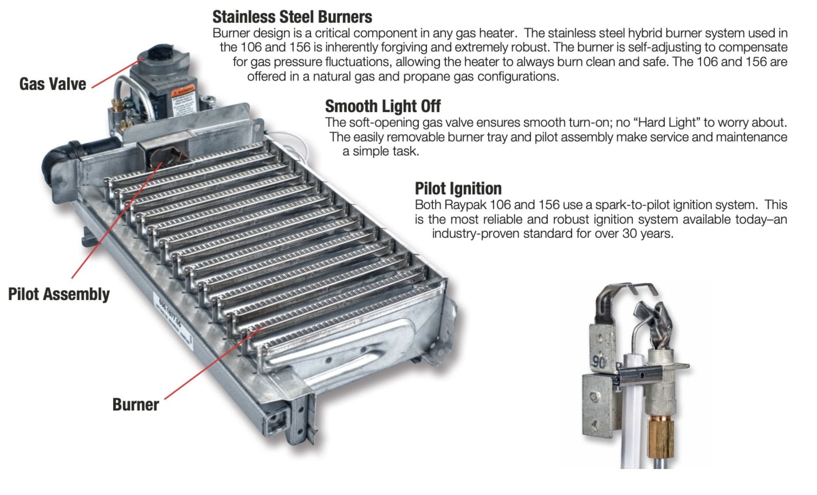 The Raypak 106 comes standard with a built in water bypass so it can handle different GPM’s without having to adjust your flow rates manually. The bypass also helps keep a constant engineered flow through the tubes to help reduce condensation caused by cold water.