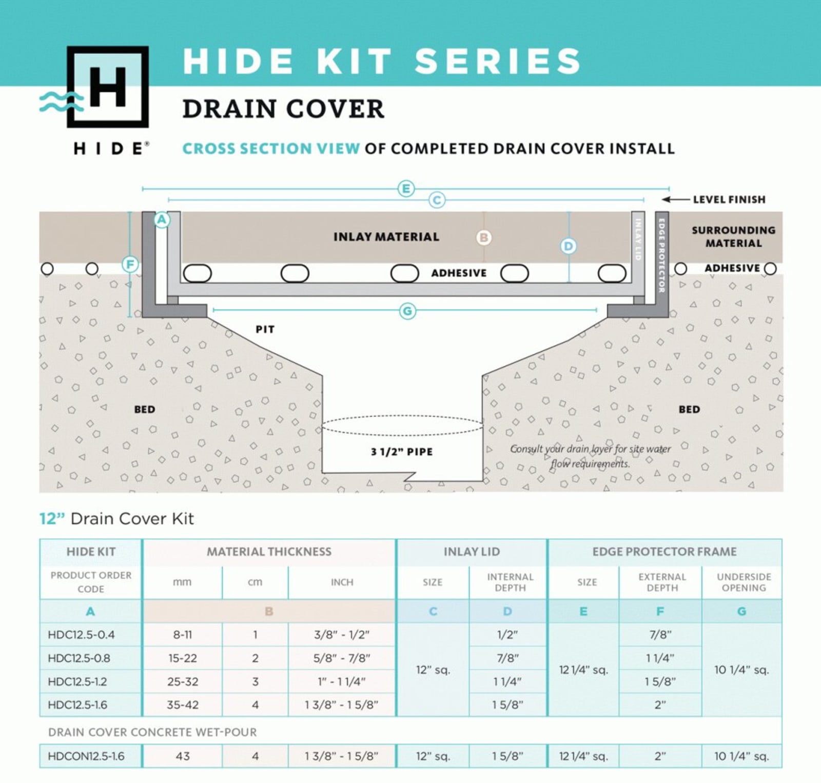HIDE HDC12.5-1.6 112" x 12" Drain Cover Kit 1-3/8"-1-5/8" Depth provides a flush seamless finish. Drain and pit not included, cover only. Designed to suit a mortar gradient to pipe. Underside opening clearance of 10 1/4".