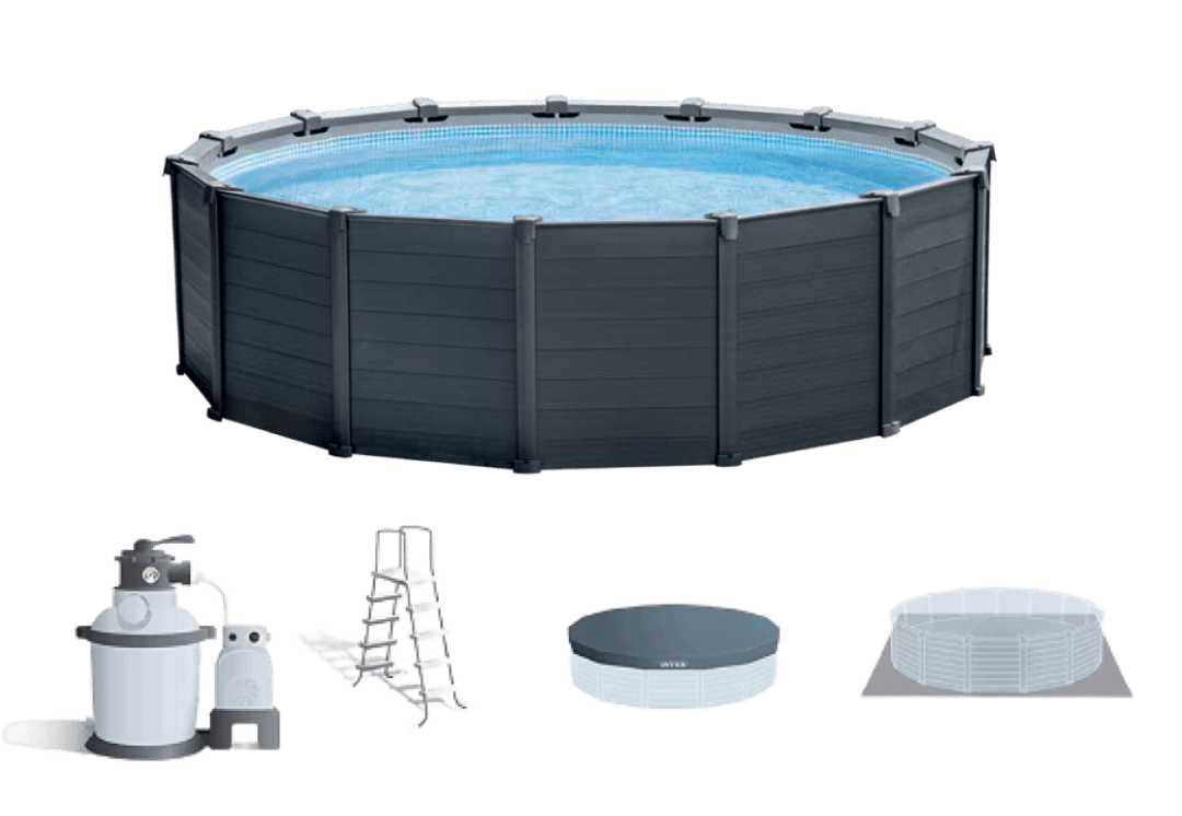 Made of a high density plastic with a graphite wood look finish. This Intex pool is ready for your friends and family with its considerable size and ease of setup. Included is a sand filter to keep your water crystal clear and a ladder for easy access in and out.