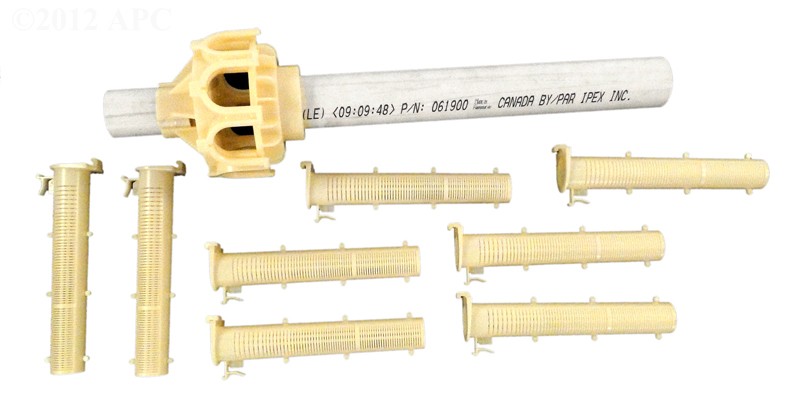 This replacement Standpipe Assembly includes the standpipe, manifold hub, and (8) laterals. This assembly is designed to fit Jacuzzi Sand Trap RMST-24 model filters. The RMST-24 filter has a 24" diameter tank. This is a new, OEM Jacuzzi Bros part, number: 42292640K.