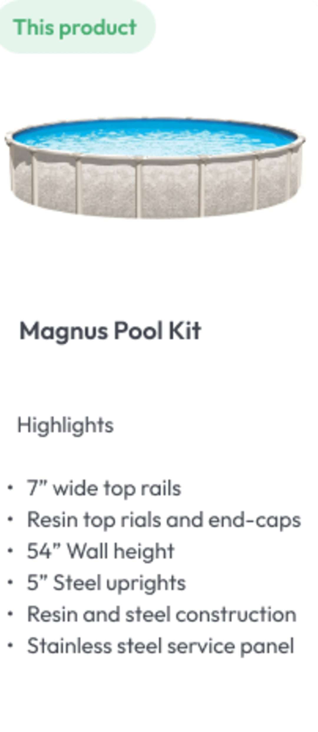 Magnus 21' Round, 54" Deep Above Ground Pool. The Magnus model comes with a resin coated Pearl colored steel wall, and a resin coated steel frame. The top ledge is 7-Inch wide and is made from a Synpro resin. The ledge caps are all resin and feature rounded corners that hide screws. The Magnus has 5-Inch resin coated steel uprights. This pool also features a stainless steel service panel where the skimmer and return fitting connect. This pool Includes the widemouth thru-wall skimmer, and return fitting assembly. Liner and pool equipment must be purchased separately.