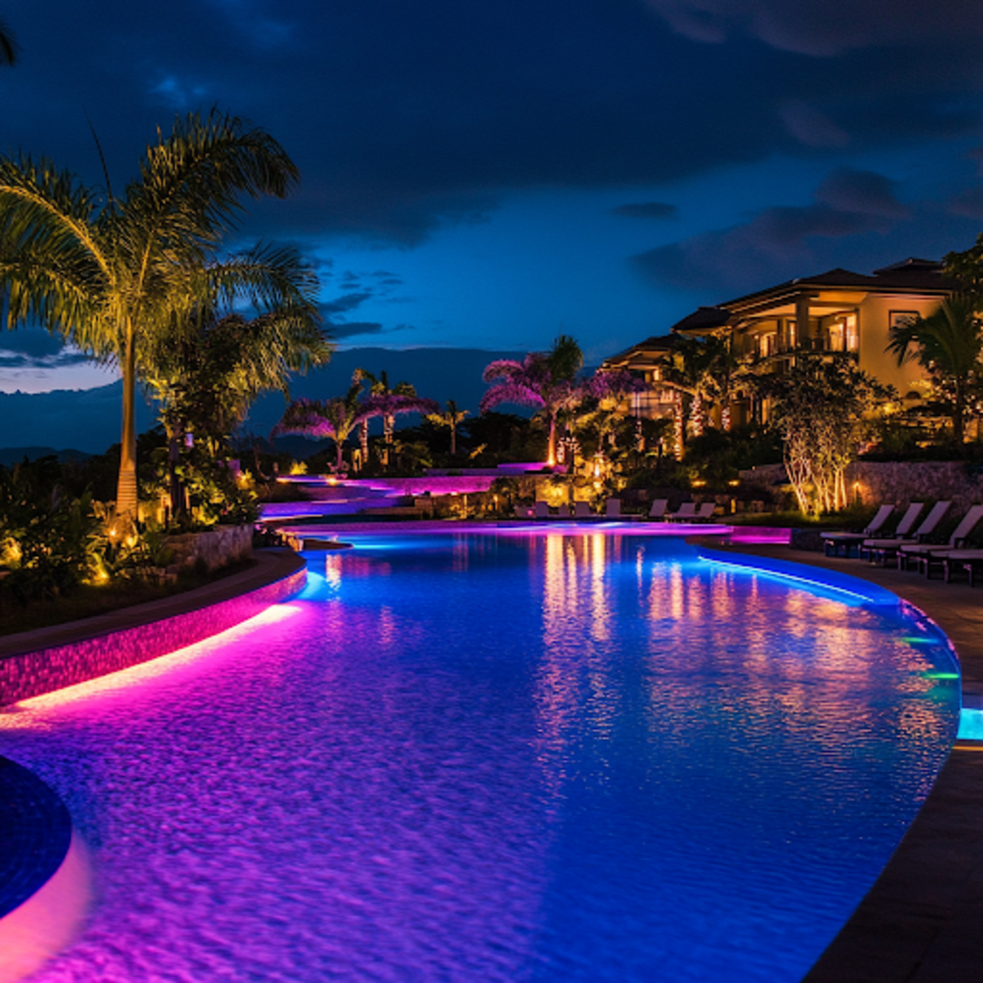 Strategically position lights to highlight features like waterfalls or swim-up bars, creating a magical atmosphere.