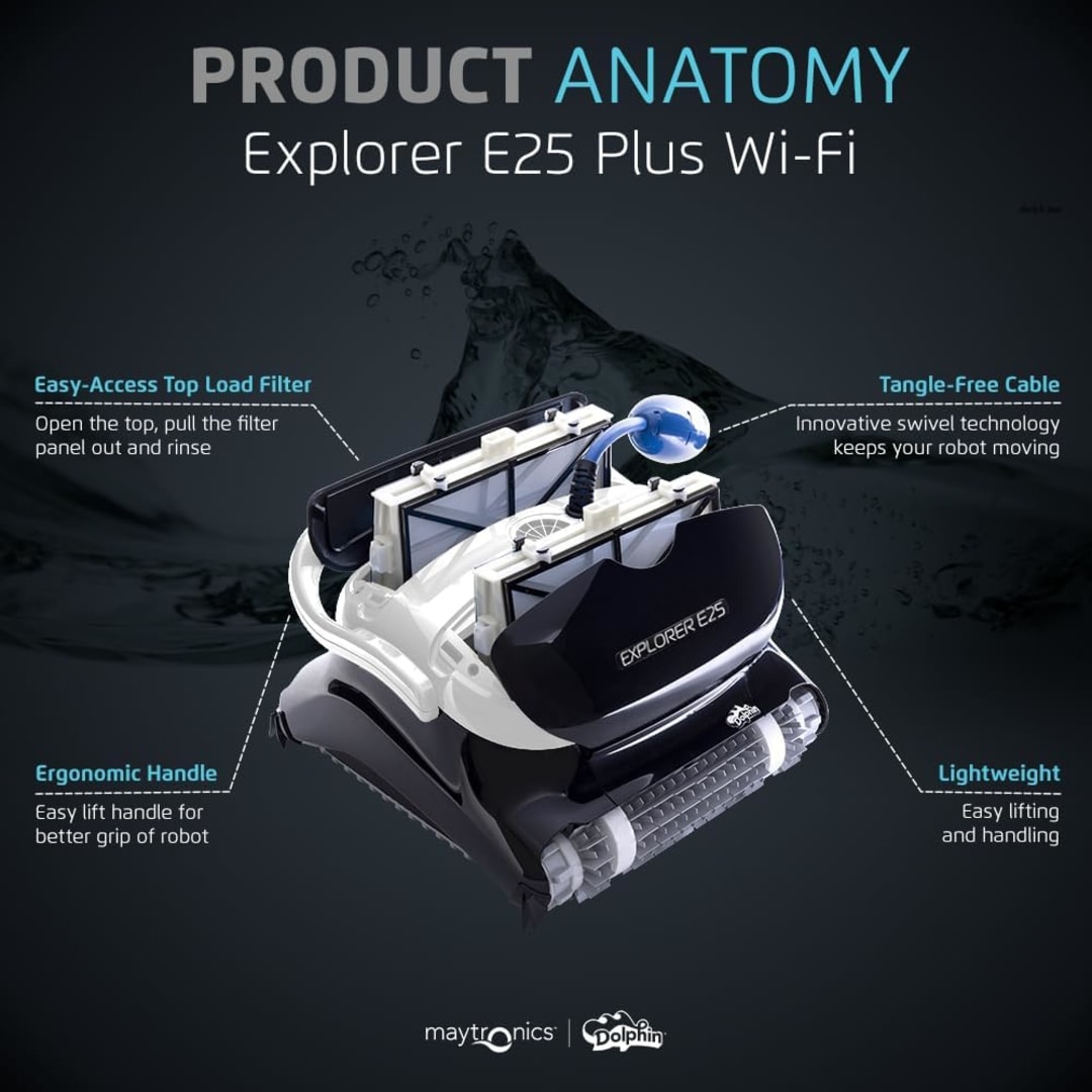| Product Name | Dolphin Explorer E25 Wi-Fi Robotic Pool Cleaner – Automatic Vacuum with Wall Climbing & Scrubbing for In-Ground Pools up to 50ft |