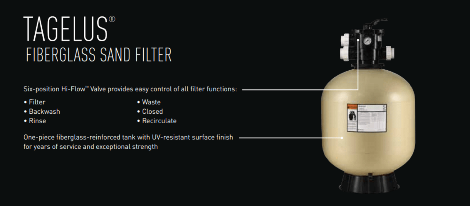 fiberglass reinforced tank with superior strength and durability. Tagelus Top Mount Filters are equipped with a six-position, top-mounted multiport valve.