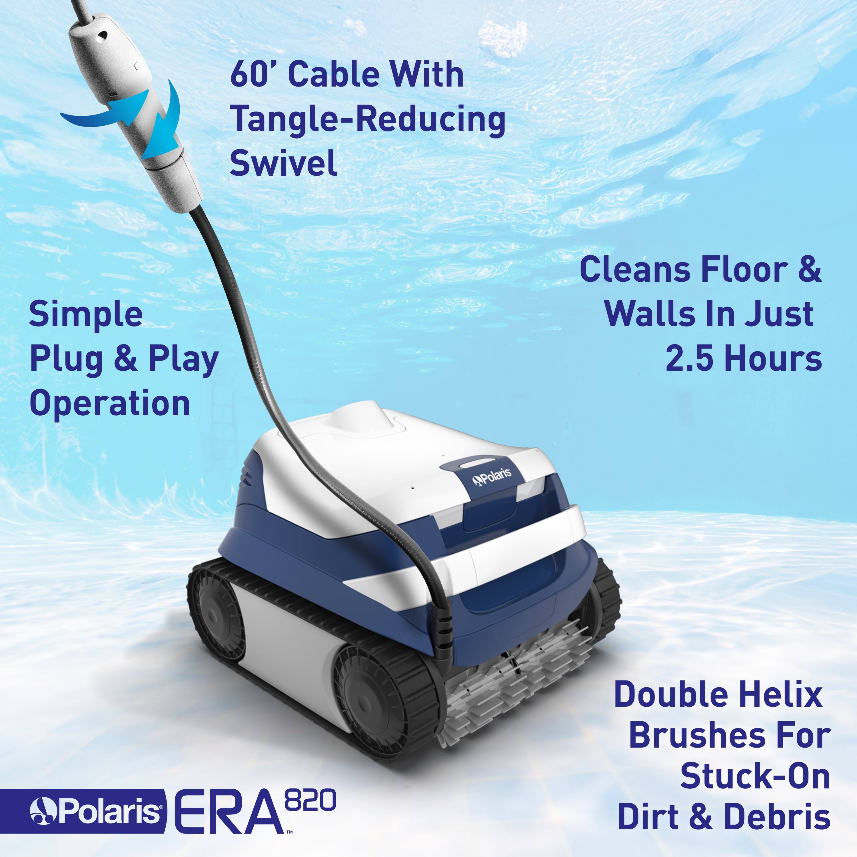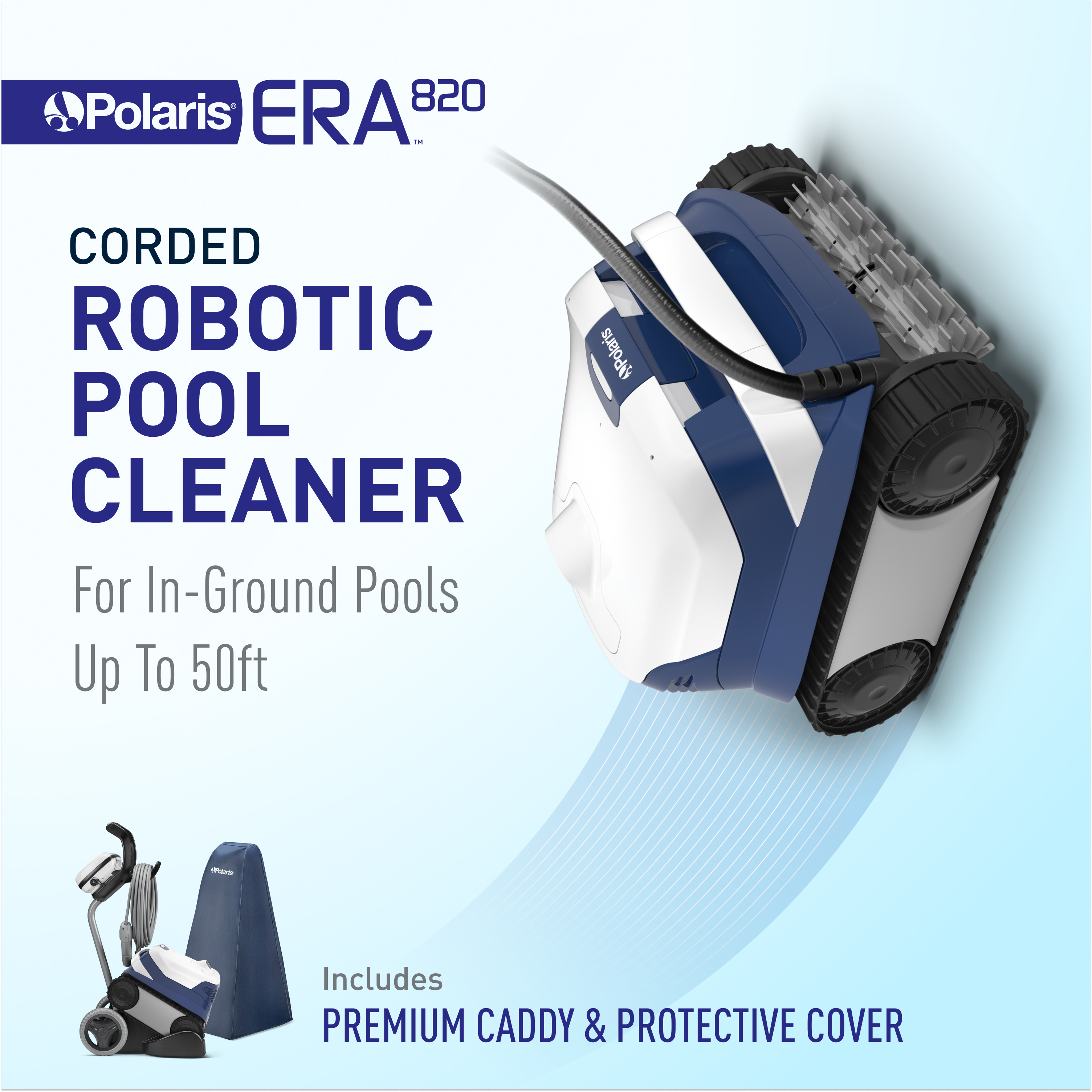 Designed for easy and efficient pool cleaning, the PolarisERA820 Robotic Cleaner delivers powerful suction with Cyclonic Vacuum Technology for optimal debris capture while maintaining superior performance. Its dual-traction rotating brushes actively scrub surfaces for thorough cleaning, and the canister makes debris removal a breeze. The 60-foot cable with a swivel prevents tangling, while its 2.5-hour cleaning cycle efficiently covers pool floors and walls. With a sleek, modern design that enhances durability, the ERA 820 includes a transport caddy and protective cover-offering a convenient, ready-to-use solution for homeowners.