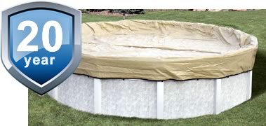 Warranty: 20 Year Emperor solid winter cover for 21'X41' oval above ground pool (Cover = 25'x45' oval). 8 mil, black on tan triple laminated polyethylene with heat sealed seams for added strength. Edges incorporate a sewn-in polypropylene cord for reinforcement. Aluminum grommets spaced every three feet. Deluxe aluminum cable winch and vinyl coated steel lock-down cable included.