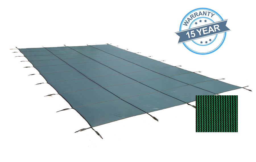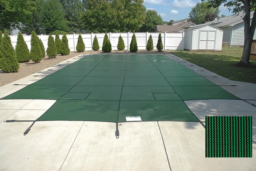 PoolTux CSPTGME16320 Royal Mesh 16x32 (Pool Size) Rectangular Safety Cover; Green. Tightly woven mesh gives your pool affordable protection with uncompromised quality. Dirt and debris are kept out but allows water; rain and melted snow to drain through making for an easy spring opening. 5' x 5' strap grid. All flush mount collars and anchors are non-corrosive and easy to adjust. Cover comes complete with flush mount brass anchors; commercial grade stainless steel springs; installation rod; tamping tool; and storage bag. 15 year limited warranty; 3 full. (Cover Size: 18' x 34')