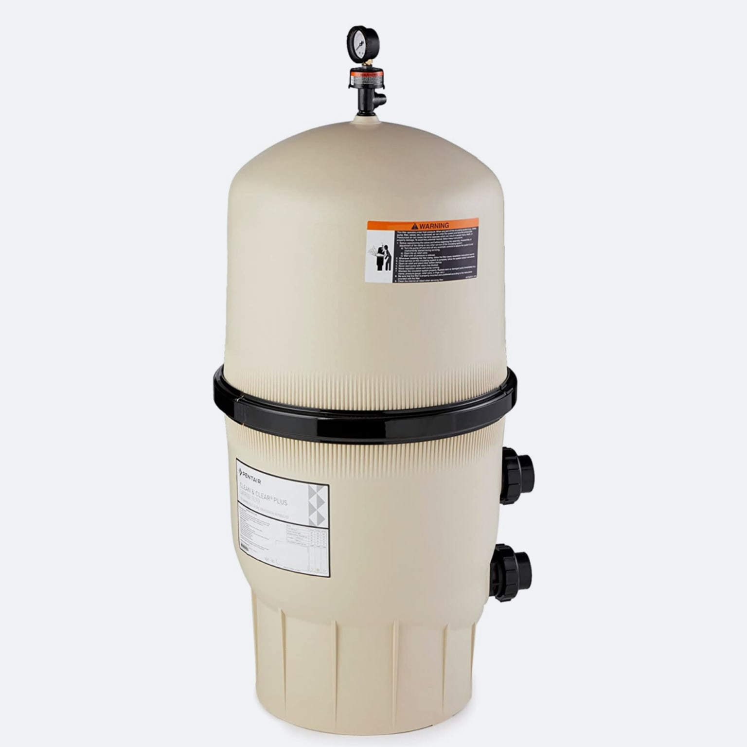 The Clean & Clear Plus Filter combines top-end filter performance with low maintenance. This dependable design uses special filter elements to strip tiny particles from your pool water, some as small as 20 microns (an average grain of beach sand is 1,000 microns). Our four-cartridge design provides maximum filter surface area to capture more dirt and extend time between cleanings. And cleaning is a snap—open the top, remove the cartridges, hose them off and the Clean & Clear Plus Filter is ready to go again. Includes Cartridge, Pressure Gauge, Union Kit and Air Relief Valve.