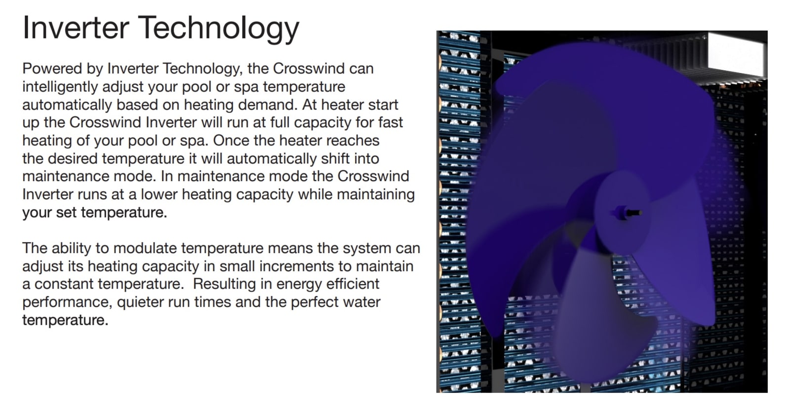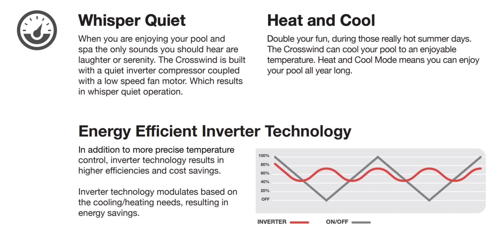 Enjoy the perfect temperature with ease. The Crosswind pool and spa heater is designed with intelligence, whisper quiet operation and energy efficiency. Crosswind’s inverter technology automatically adjusts and controls your pool temperature, to save energy and money. With its whisper quiet operation, you will forget it’s there. The compact size makes installation a breeze. Part Number: 017740 Inverter technology for energy efficient performance Whisper quiet operation Precise temperature control for higher efficiencies and cost savings