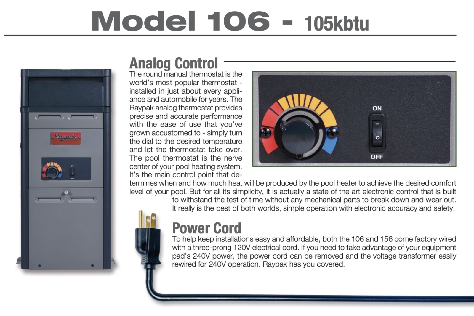 The Raypak 106A is the perfect choice for above-ground pools and spas. This may be our smallest pool and spa heater, but its built to the same exacting standards as the rest of our products. Extend your swim season, open your pool earlier and close it later. Your pool is always ready when you have a Raypak on duty.
