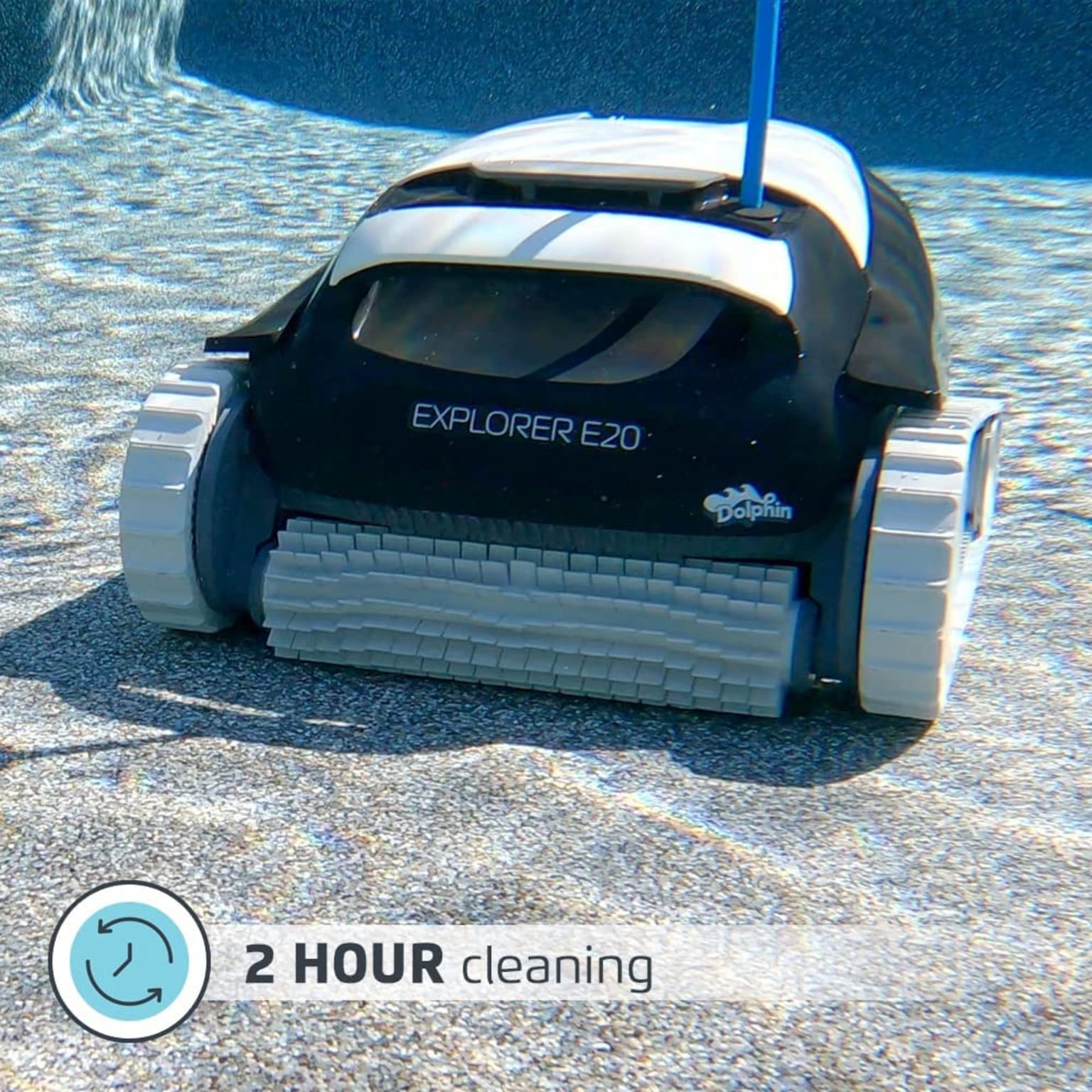 • Sit back, relax while the Dolphin Explorer E20 robotic pool cleaner takes care of the pool for you. Ideal for in-ground swimming pools up to 33 feet in length, this easy to use, compact cleaner will have your pool ready in just 2 hours.