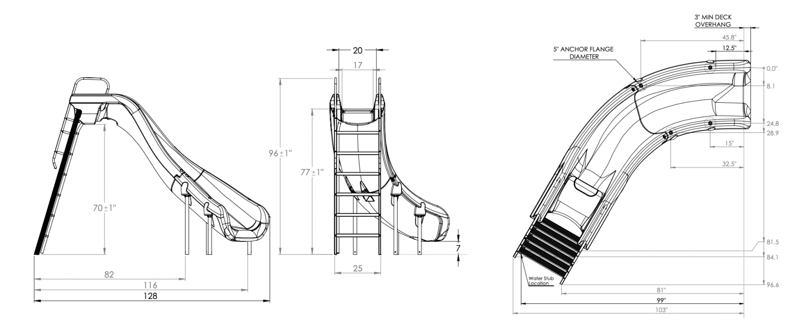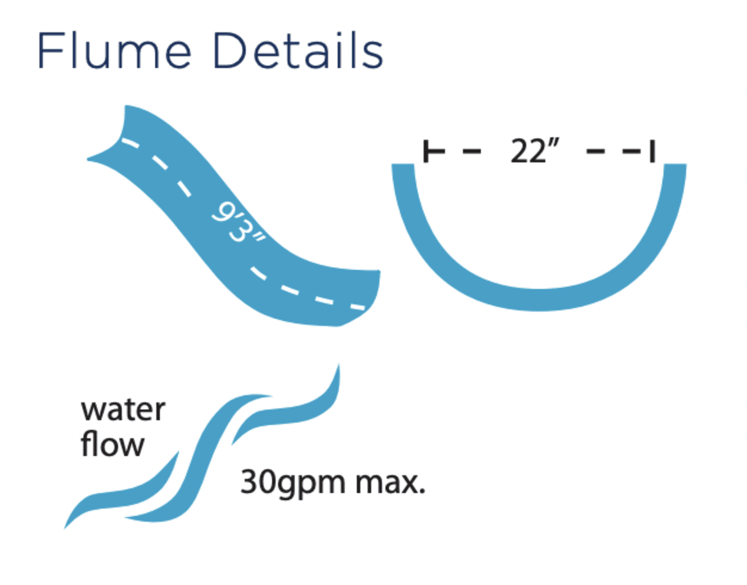 Specifications: Height: 8' (6'6" to seat). Available in right and left curves. Flume is 9'3" in length. Required deck space: 10'7" x 8'5". Weight limit: 250 lbs. Flanges must be purchased separately - part number 75-209-5866. For residential use only.