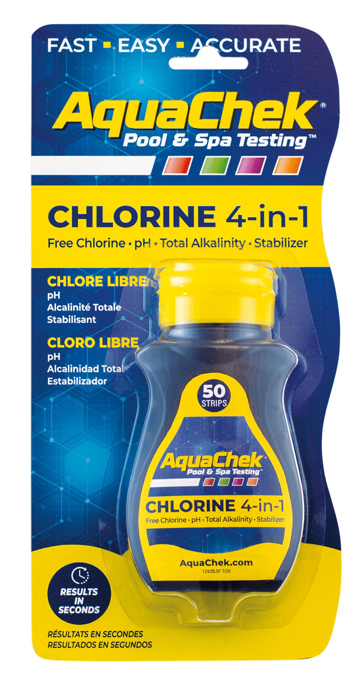 Swimming Pool Chlorine Test Strips by AquaChek. These test strips test for four key values Free Chlorine, Cyanuric Acid, pH and Total Alkalinity. A quantity of 50 strips per bottle. To test the water, just dip an AquaChek strip in the pool water for one second, and remove immediately. Compare the colors on the stip to the bottle, thats it! You get test results in seconds! To keep your pool at its best, test each week. It's also a good idea to write down your results each time you test, so you can track changes.